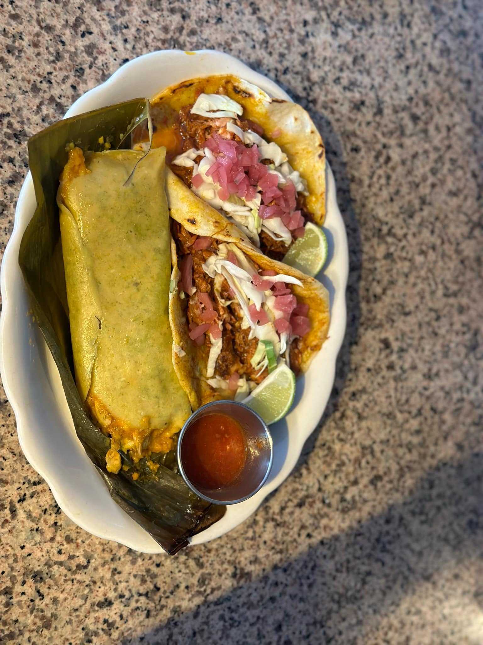Hand made organic corn tortillas with choice of meat, black beans, cabbage, onions and house tomato salsa.
